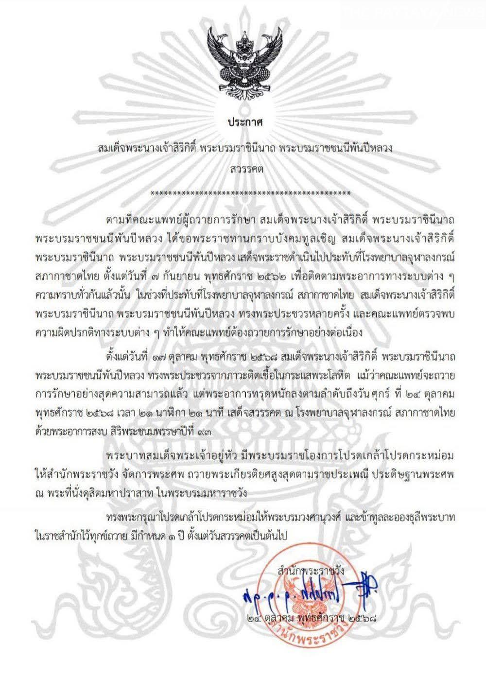 Bangkok, 24 de octubre de 2025 – La Oficina de la Casa Real anunció el fallecimiento de Su Majestad la Reina Sirikit, Reina Madre de Tailandia, el viernes 24 de octubre de 2025 a las 21:9. Falleció pacíficamente en el Hospital Chulalongkorn de la Cruz Roja Tailandesa, a la edad de 93 años.